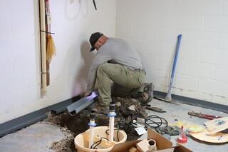 Nik is installing the interior discharge line to ensure proper drainage from sump pump.