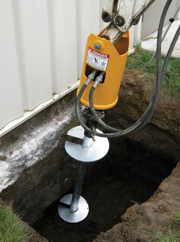 By measuring turning resistance as a pier is driven, the contractor can determine when the pier has reached competent load-bearing soil. Piers are connected to the foundation with strong steel brackets.